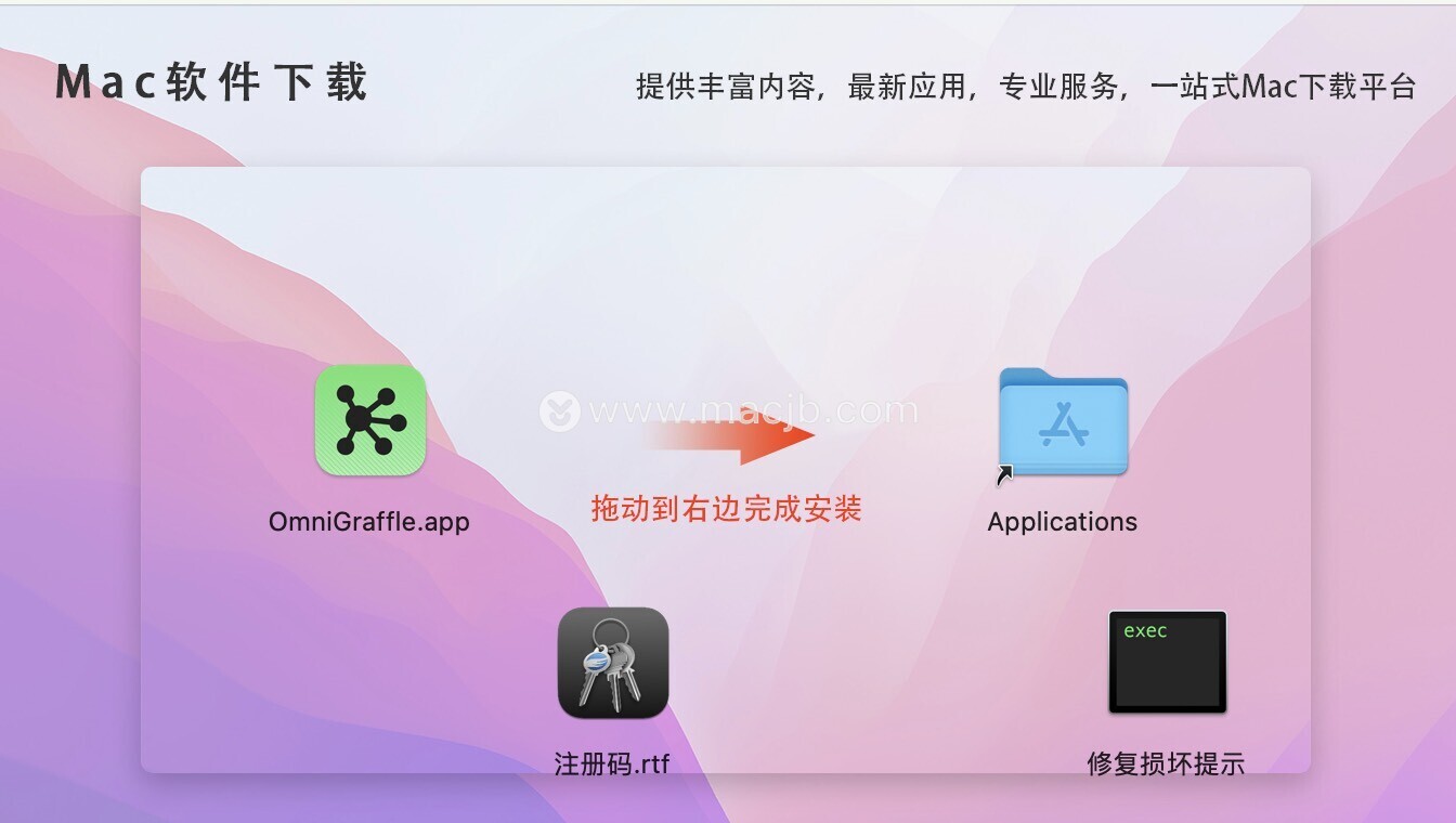 软件下载完成后打开,拖动OmniGraffle到右边的应用程序中进行安装