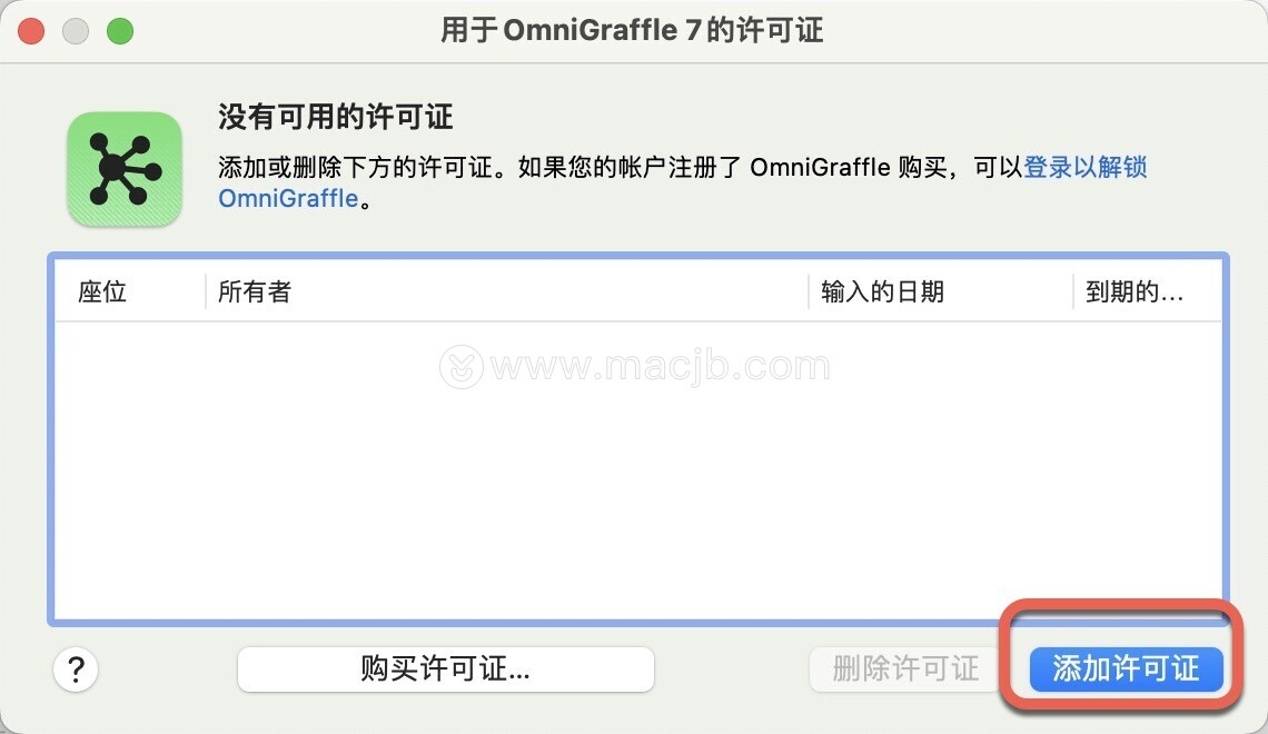 安装完成后打开,在OmniGraffle菜单栏选择许可证