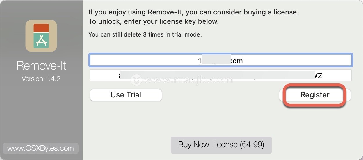 填入自己的邮箱地址,然后将注册码复制粘贴到注册框中点击register即可成功激活!(双击复制注册码)