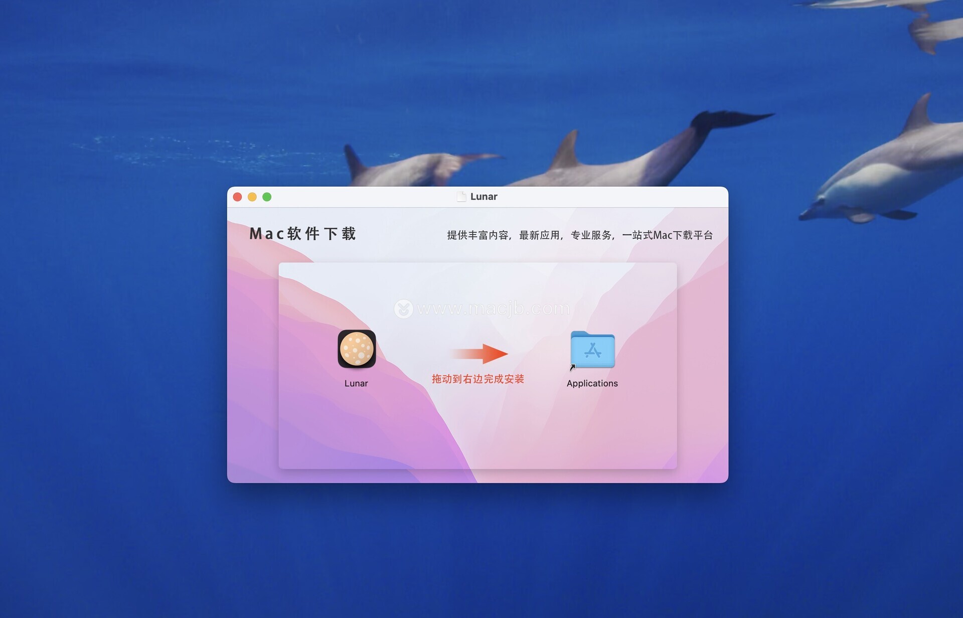 安装包下载完成后,拖动左侧的Lunar到右侧应用程序中即可