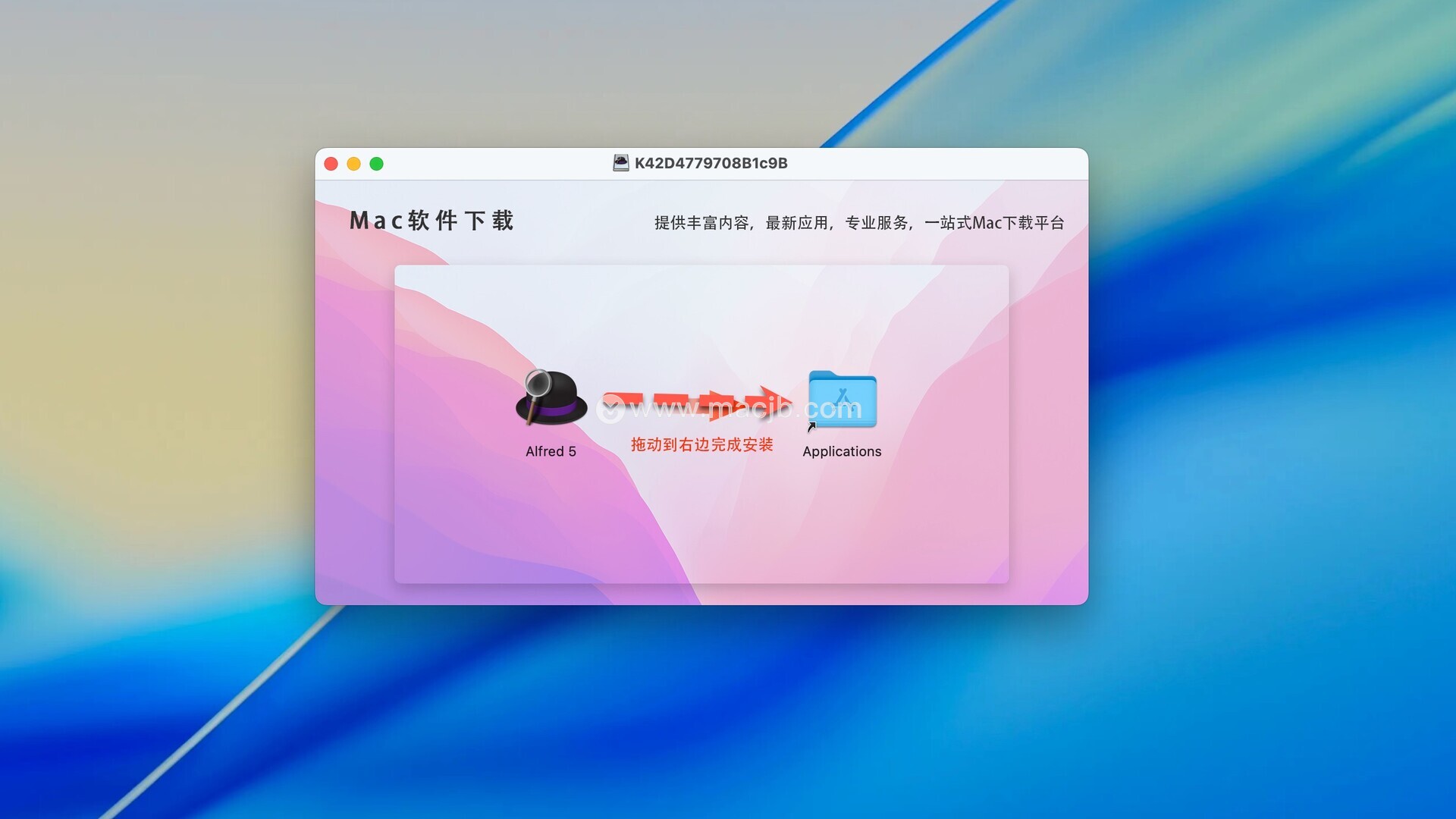 将左侧的Alfred 5拖动到右侧的applications中即可,如图