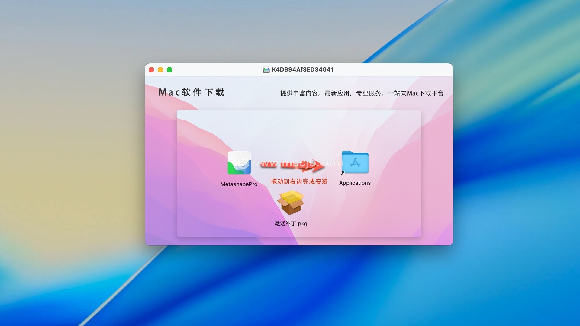 下载完成后打开,将左侧MetashapePro和Agisoft Utilities拖入右侧Applications中进行安装即可