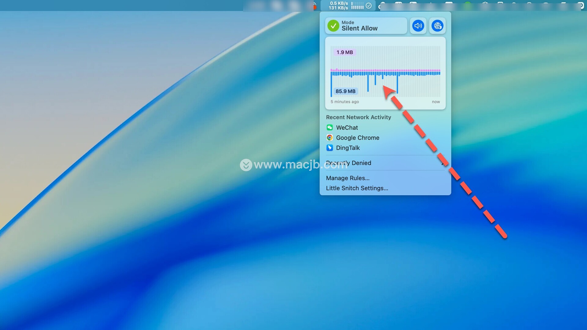 Little Snitch 控制中心位于菜单栏中,显示当前网络活动、最近拒绝的连接,让您控制操作模式等。