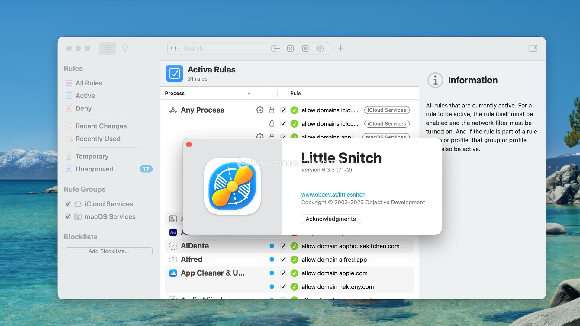 Little Snitch for Mac是一款网络安全软件,旨在保护用户的隐私和网络安全。它能够实时监控和控制网络活动,防止恶意软件和外部攻击的入侵。