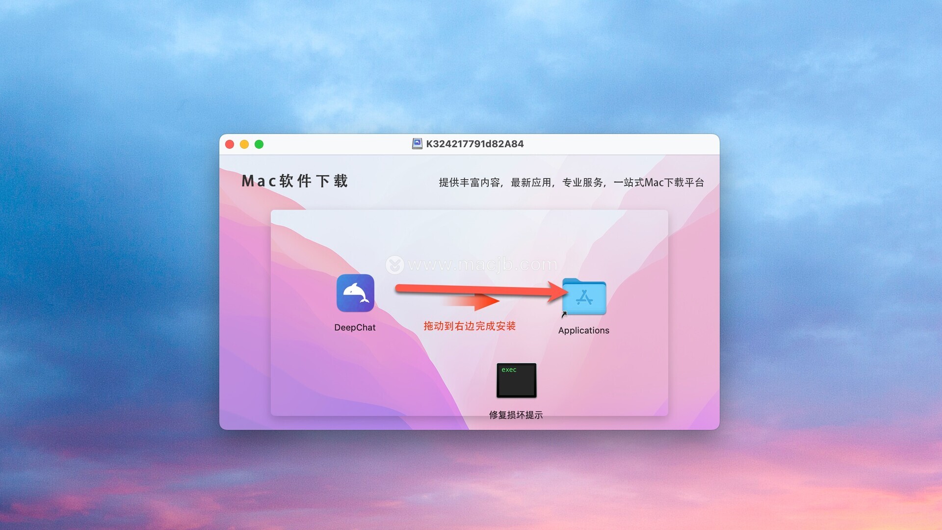 DeepChat下载完成后打开,根据自己的系统选择程序拖动到右侧应用程序中即可
