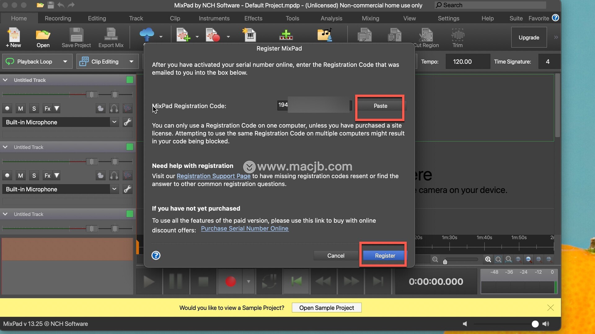 在应用程序中找到然后打开,点击左上角MixPad-Registar进行激活,如图