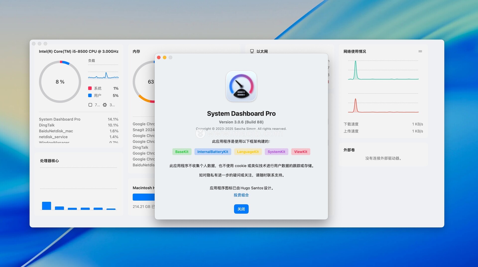System Dashboard Pro for Mac是一款Mac OS X上的系统监控工具。它可以提供有关您的Mac及其硬件组件,如CPU、内存、磁盘使用情况、温度等的实时信息。此外,它还可以显示网络活动和应用程序行为,以便您可以更好地了解您的Mac正在运行什么和如何运行。