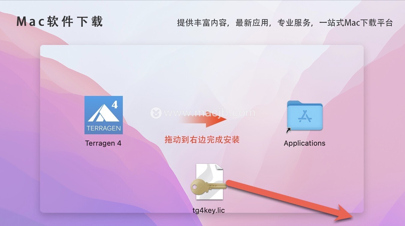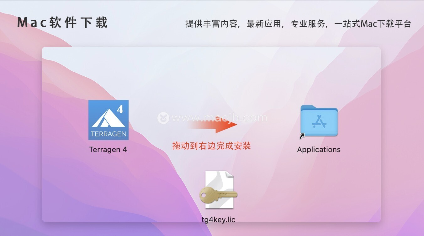 下载完成后打开镜像包,拖动Terragen 4渲染软件到右边应用程序中安装,如下图: