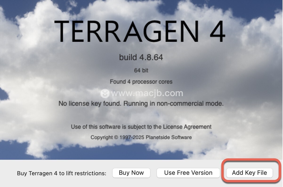 应用程序中打开Terragen 4软件,弹出购买页面,点击添加密钥文件Add Key File按钮。