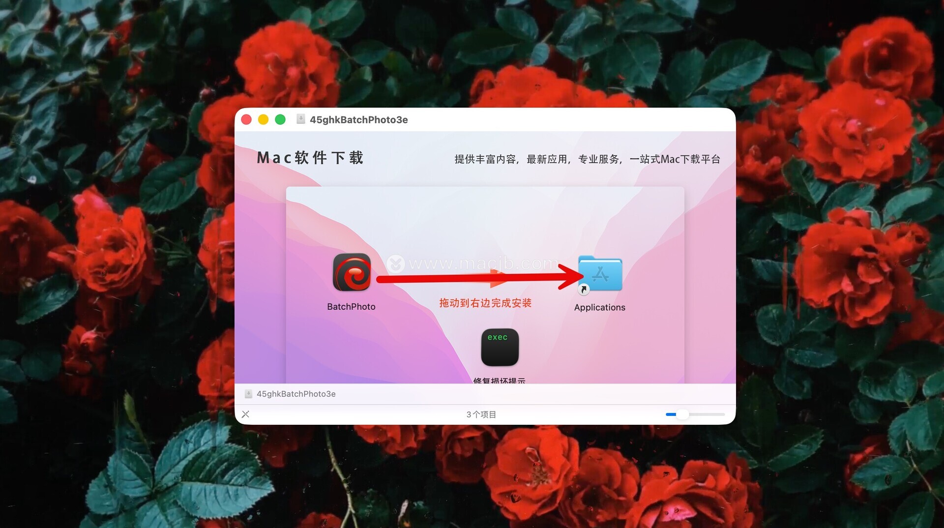 将左侧的BatchPhoto Pro 拖动到右侧的应用程序中即可,如图