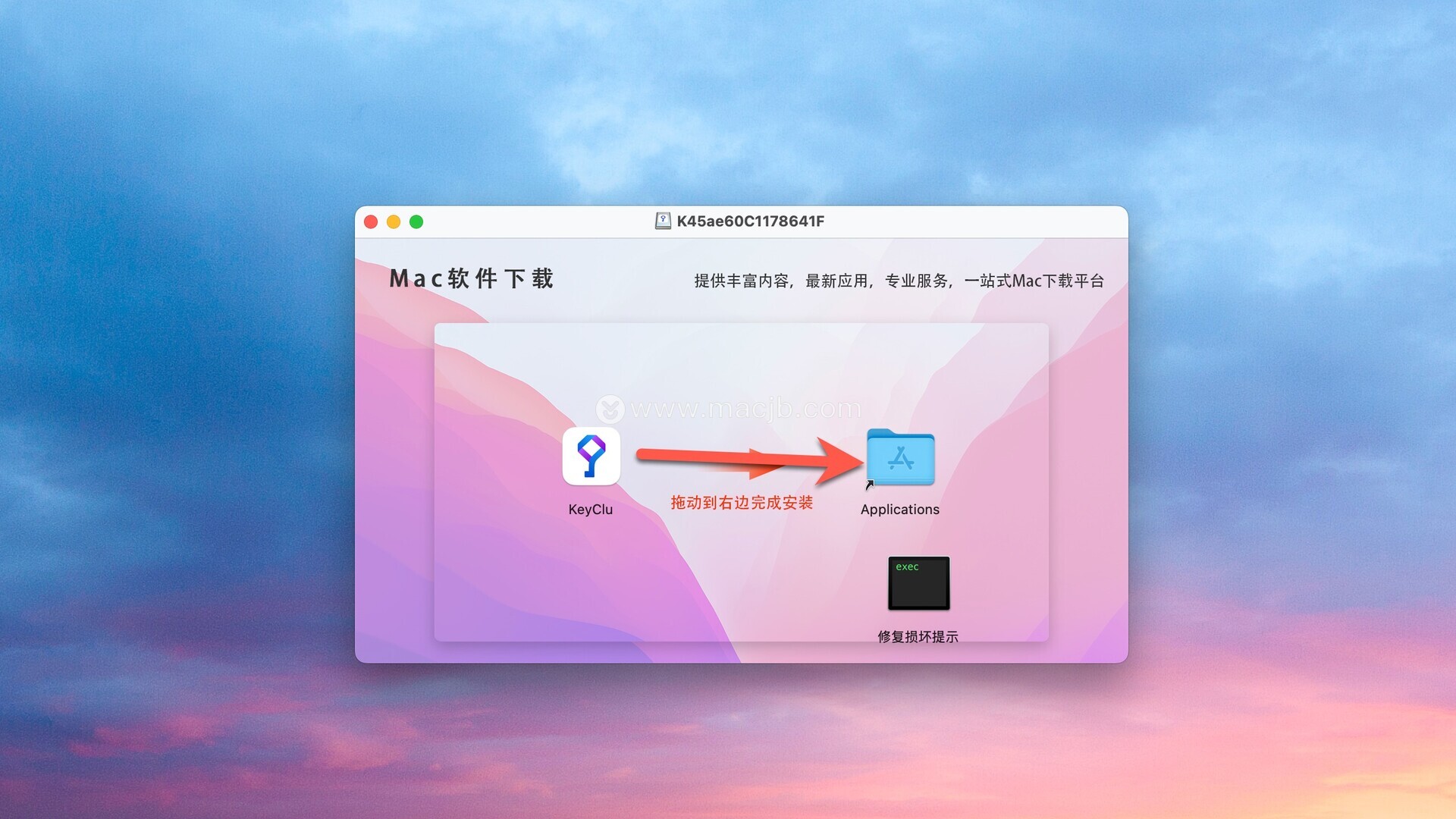将左侧的KeyClu拖动到右侧的应用程序中即可,如图