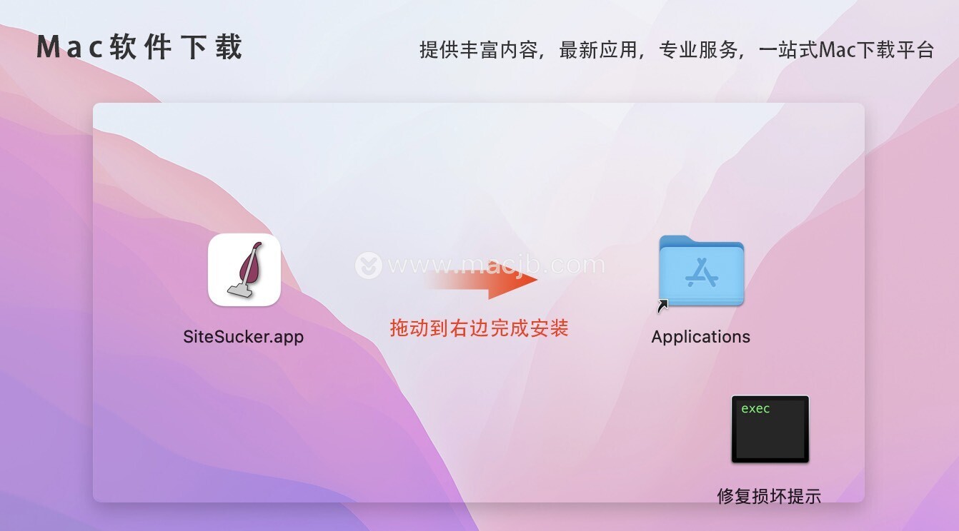 安装包下载完成后,拖动左侧的SiteSucker到右侧应用程序中进行安装即可。