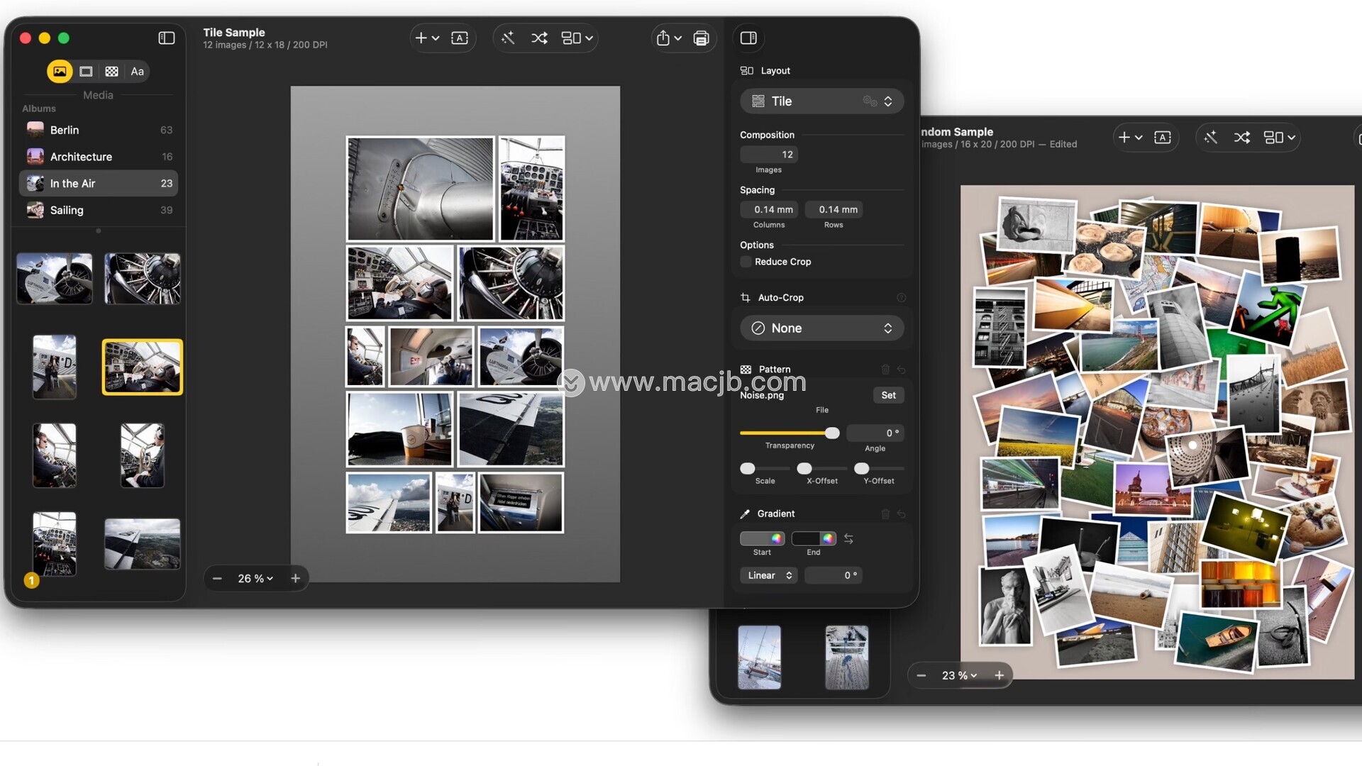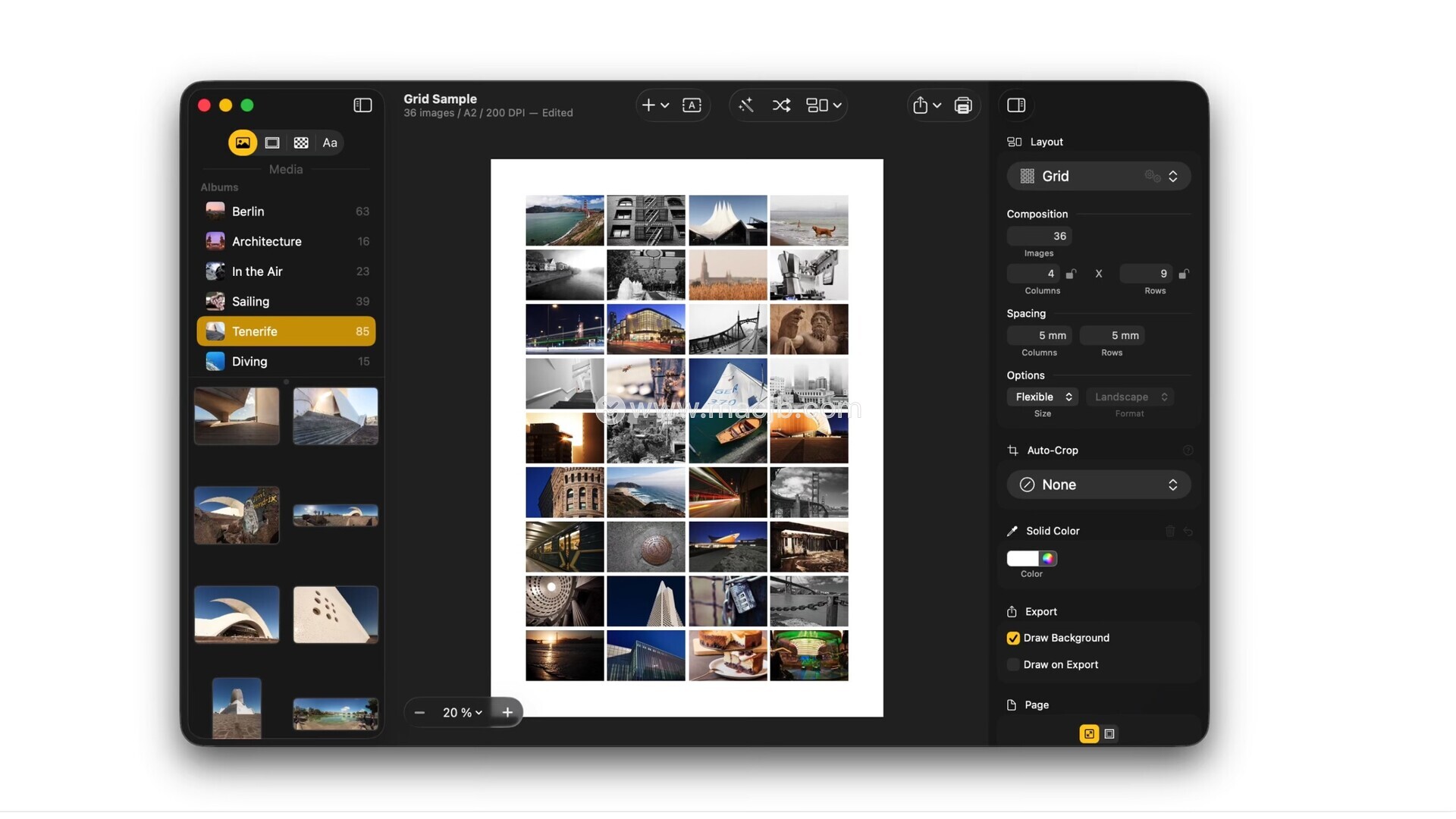 - Posterino 允许您自动裁剪一组图像以显示其主题。可以裁剪到面部、上半身或图像的主要部分。这一切只需点击一个按钮。或者 - 使用新的自动裁剪启用模板 - 完全无需点击。只需将图像拖放到自动裁剪文档上,裁剪工作就完成了。