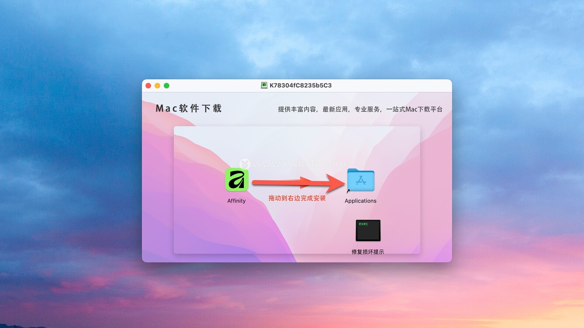 安装包下载完成后打开,将Canva Affinity拖动到右侧文件夹中即可