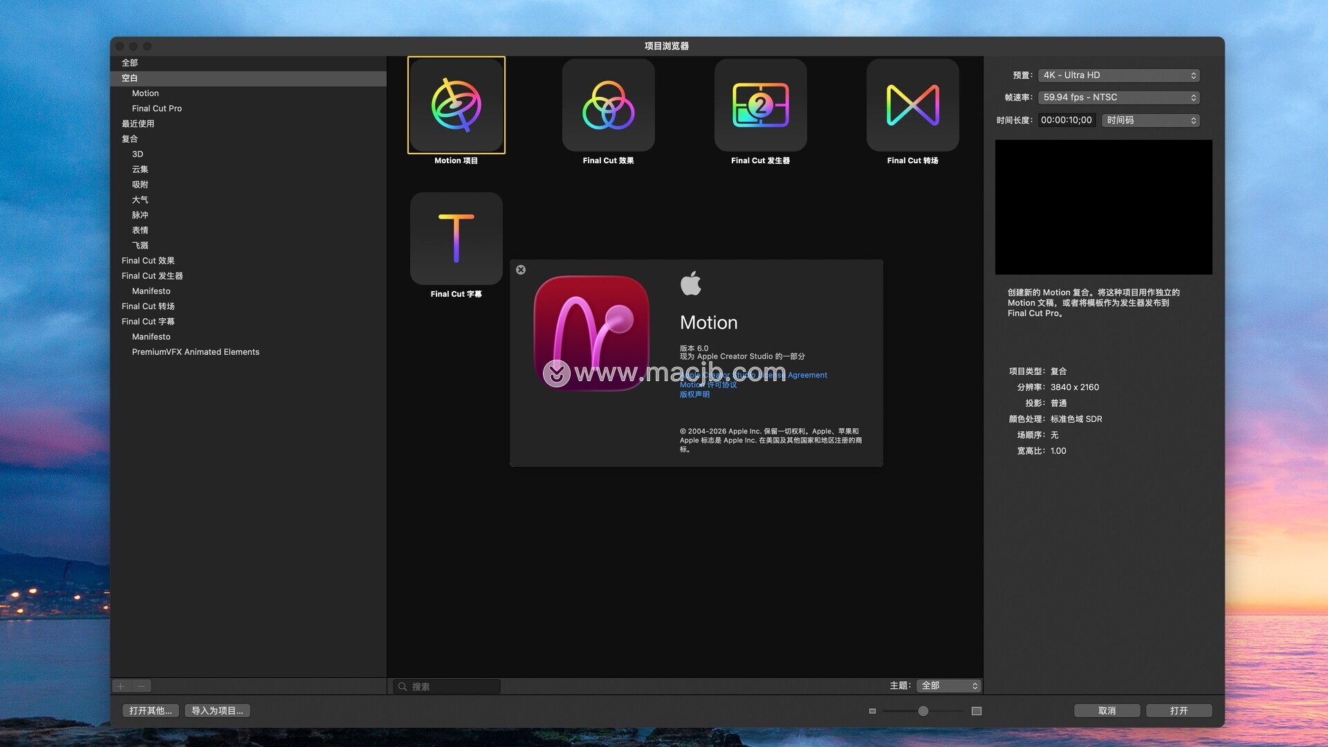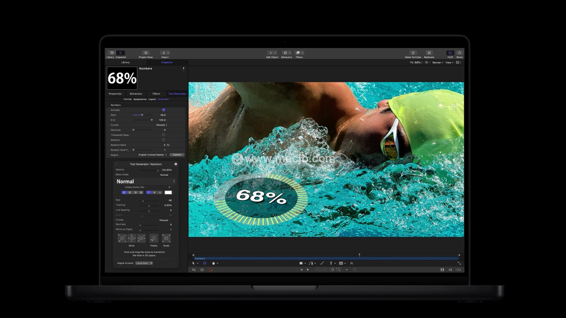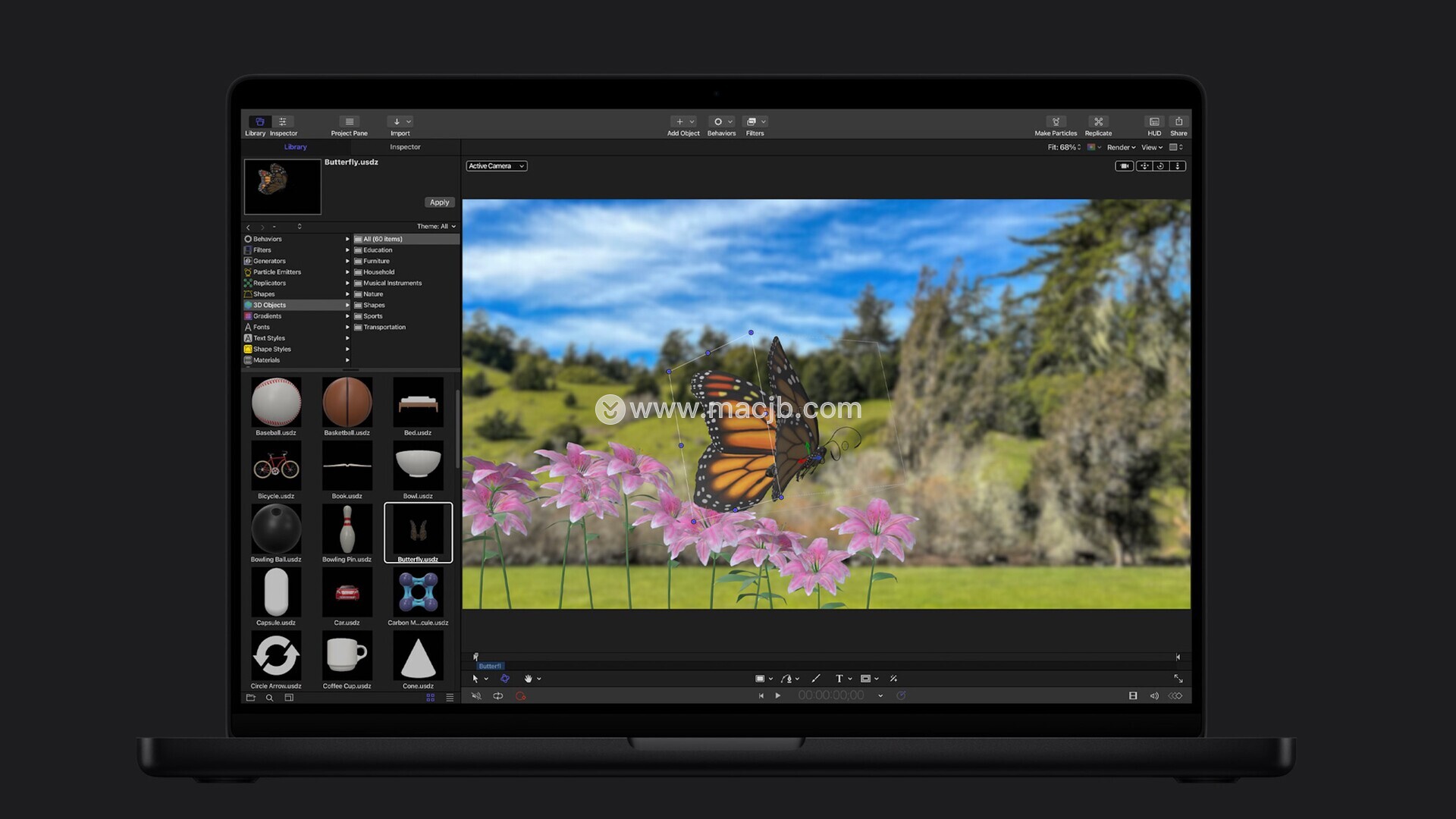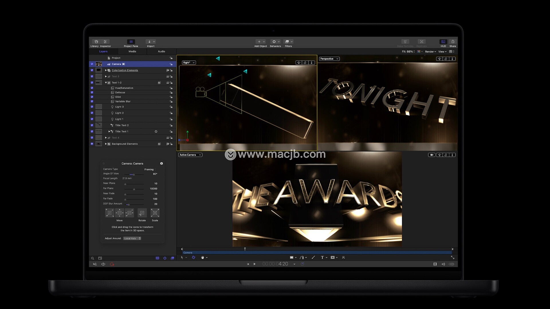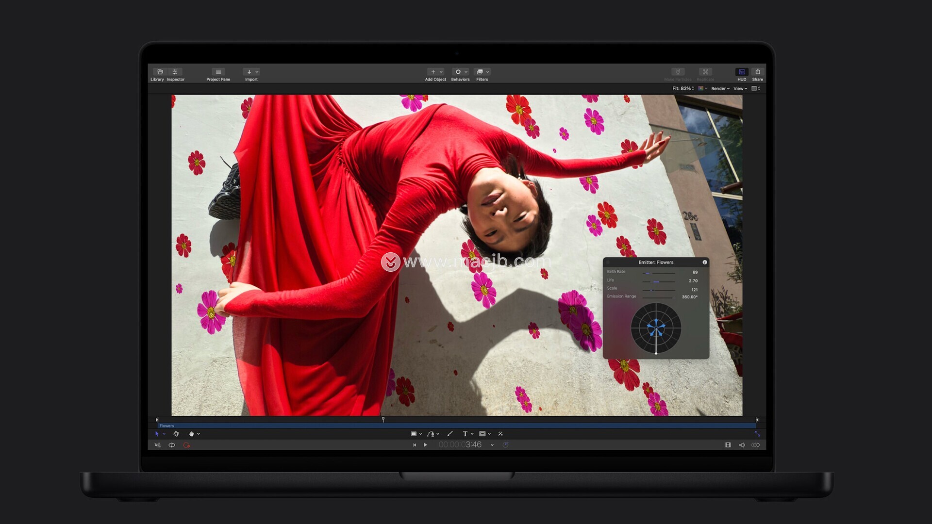 使用Motion可以轻松设计大片级的 2D、3D 和 360° 字幕、流畅的转场和逼真的特效,实时出效果。Motion 更专为 Apple 芯片和神经网络引擎优化,让你能以惊人的速度和准确度创建、播放绚丽的影像。