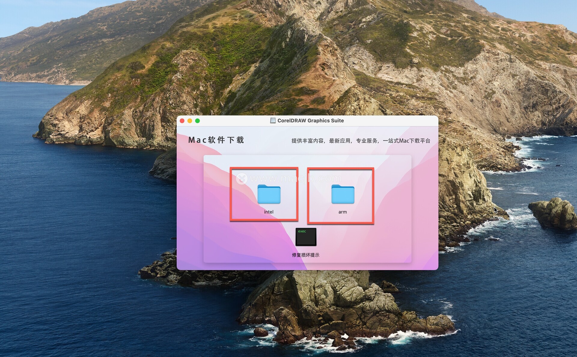 下载完成后,双击打开dmg安装包,根据自己的电脑系统选择合适的文件夹,如图: