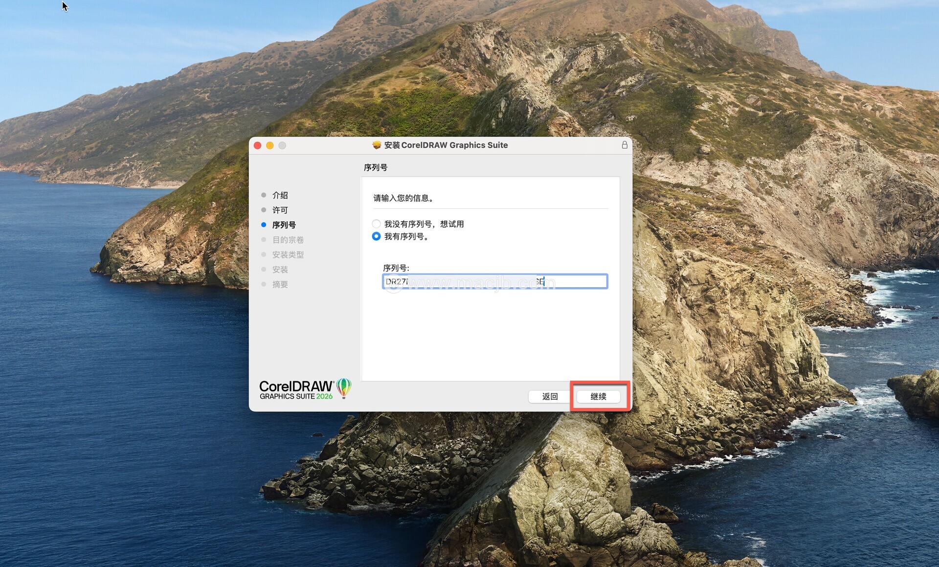 打开序列号,填入,然后点击继续直到安装完毕。如图: