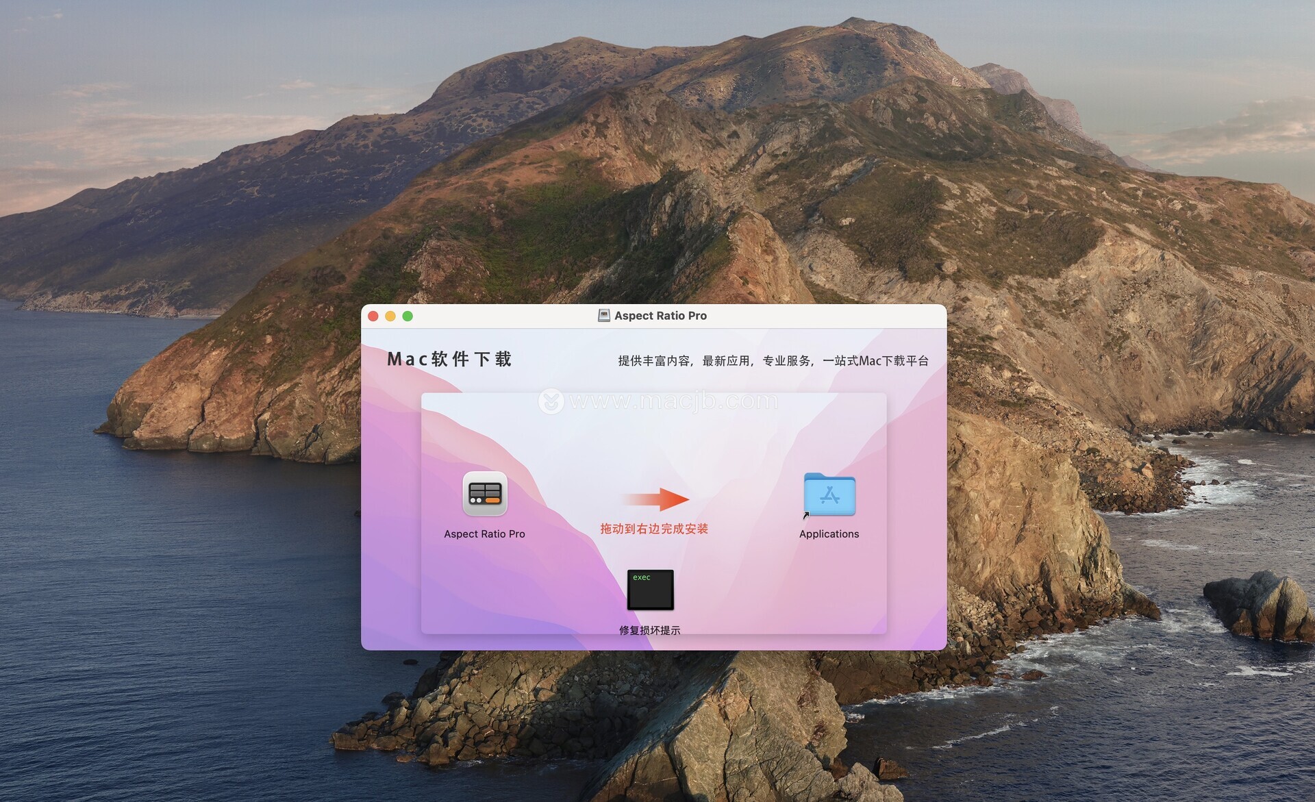 将左侧的Aspect Ratio Pro拖动到右侧的applications中即可,如图