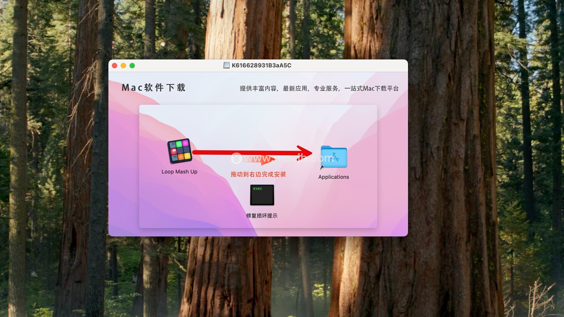 Loop Mash Up下载完成后打开,拖动左侧的软件到右侧应用程序中即可