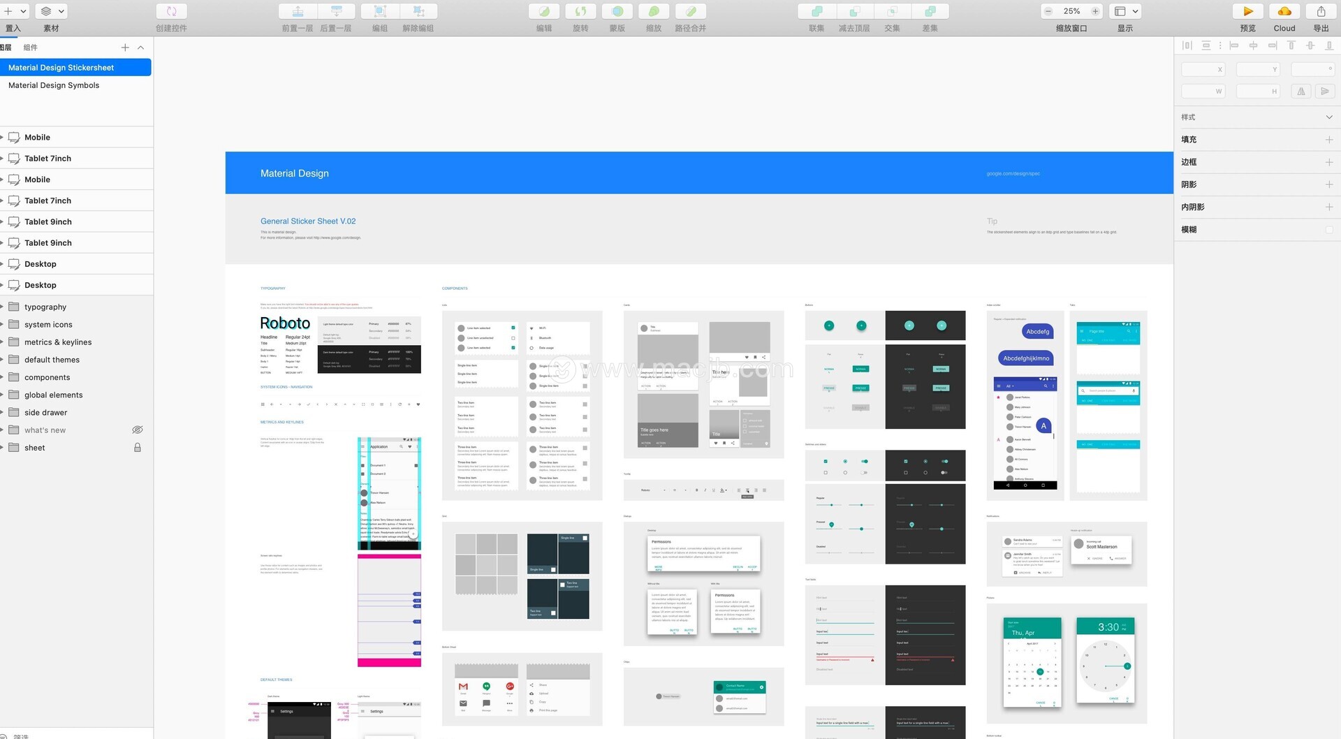 Sketch的界面非常简洁。最顶端的工具箱包含了最重要的操作,可根据个人习惯添加排列。可以用右侧的检查器将会根据你选中的工具来显示所需控件,这样你能始终不受打扰的在画布上创作。