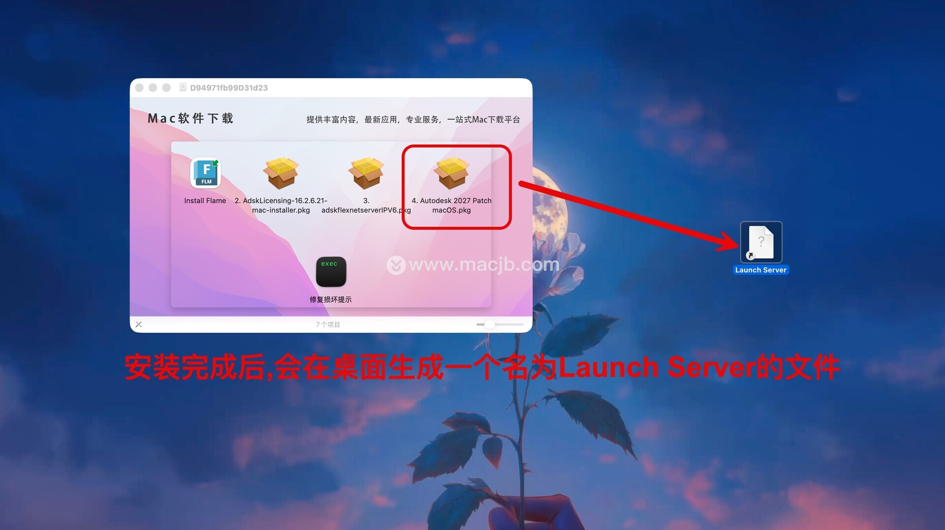 注意:激活补丁Autodesk 2027 Patch macOS.pkg安装完成后,会在桌面生成一个名为Launch Server的文件,如图