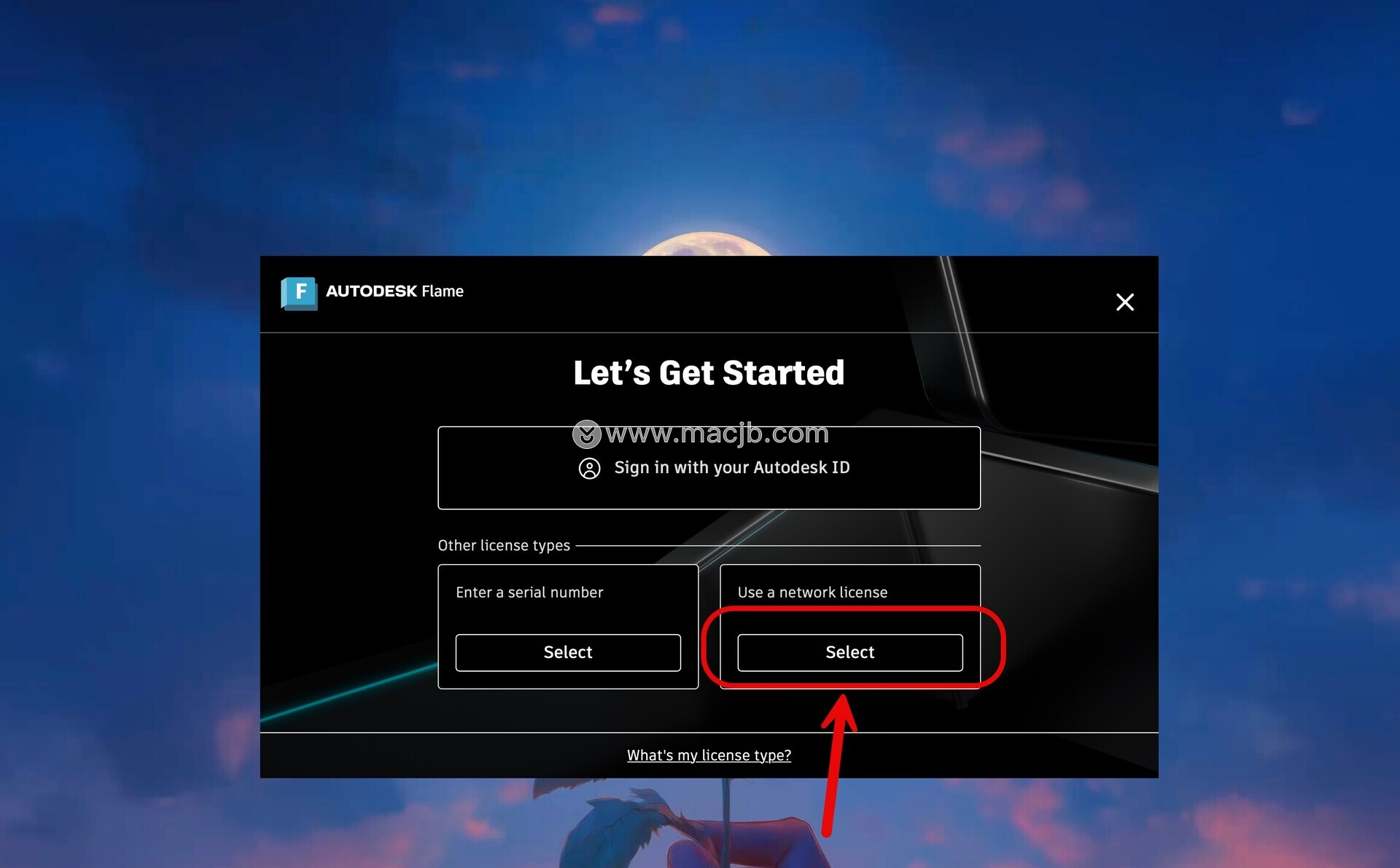 在右侧面板中找到 Use a network license (使用网络许可)并点击 Select (选择)。