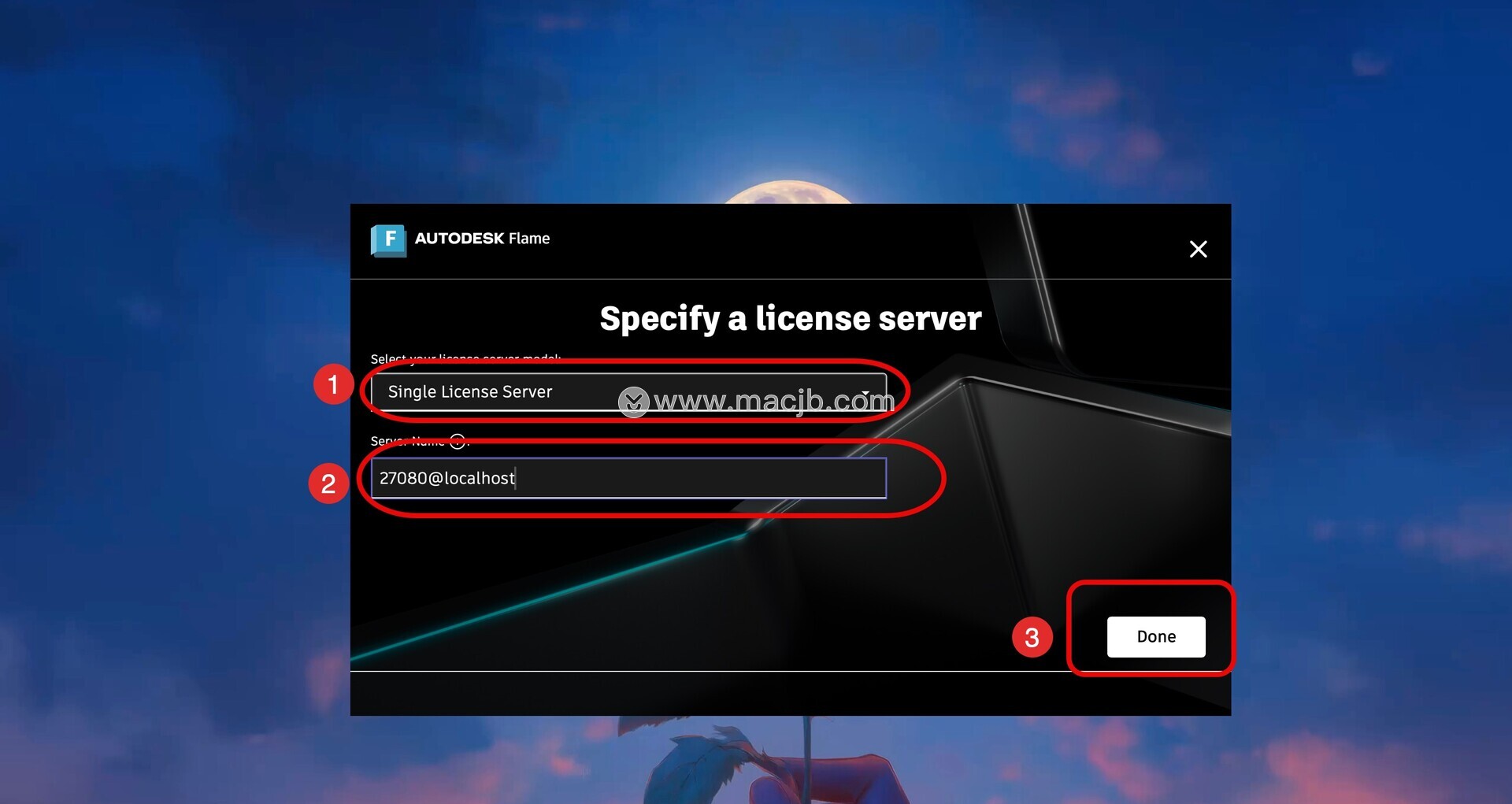 注意: 请保存好Launch Server文件,每次重新启动 Mac 后都需要运行服务器,方能运行flame软件
